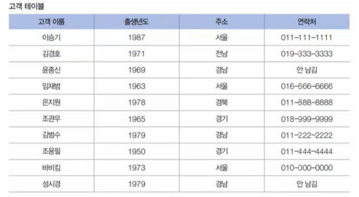 고객 테이블에 중복 회원(중복 없애기) --> 고객 이름에 PK(기본키 설정)