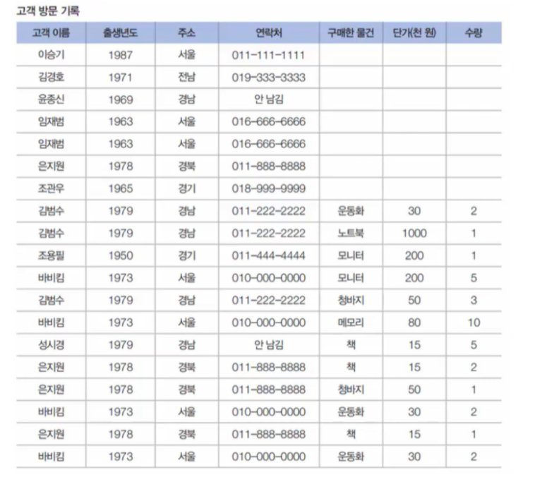 데이터 베이스에 고객 테이블과 구매 테이블 만들어서 불필요 공간 없애기