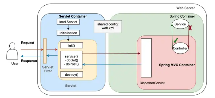 - 컨테이너는 스프링 컨트롤러로 요청을 전달합니다.