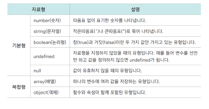 자바스크립트는 미리 변수의 자료형을 지정하지 않음 변수를 지정하고 원하는 값을 할당만 하면 됨