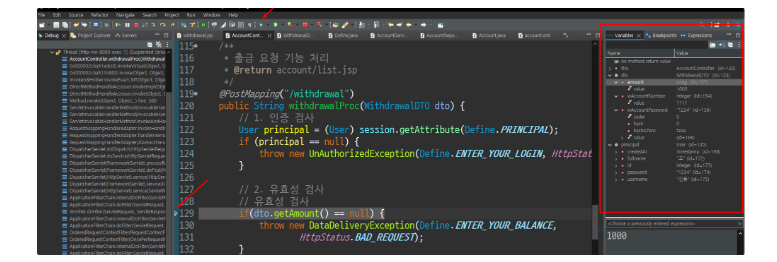 브레이크 포인트에서 실행에 흐름이 멈추는 것을 확인하고 오른쪽에 넘겨 받은 값이 정확한지 디버그 모드에서 확인할 수 있습니다.