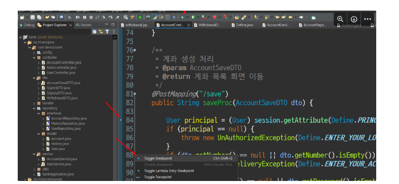 오른쪽 마우스를 클릭하고 원하는 곳(검증하는 곳)에서 브레이크 포인트를 선택해보세요
