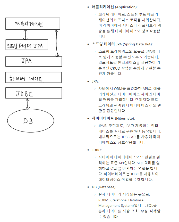- 자바 객체와 관계형 데이터베이스를 연결하여 데이터를 관리하는 표준 API입니다. JPA는 객체 지향 도메인 모델과 데이터베이스 간의 중간 역할을 하며, 데이터베이스에 대한 접근을 추상화하여 애플리케이션 코드에서 데이터베이스에 의존하지 않고 데이터를 처리할 수 있도록 합니다.