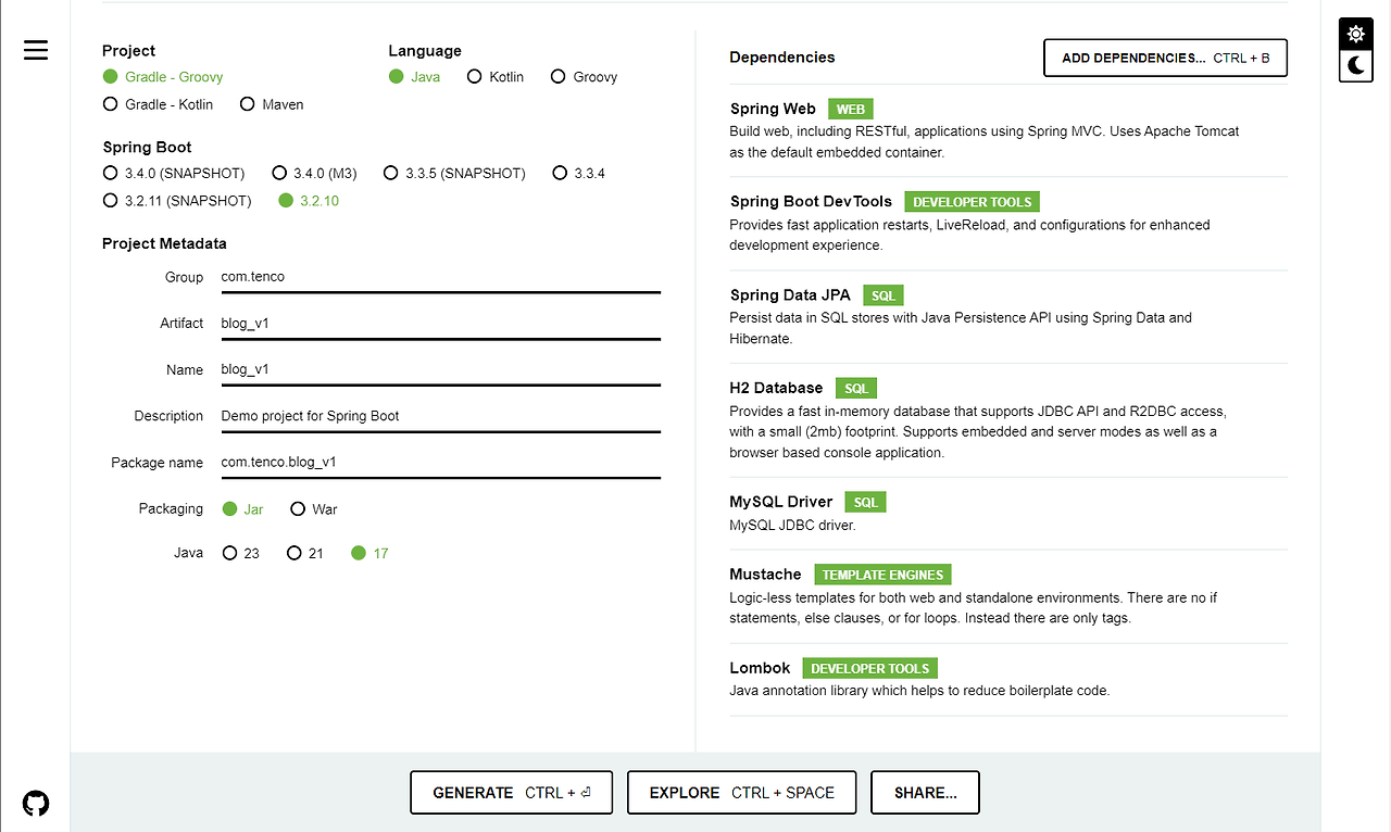 1. spring initalizr 접속 후 아래와 같이 세팅 / 다운로드