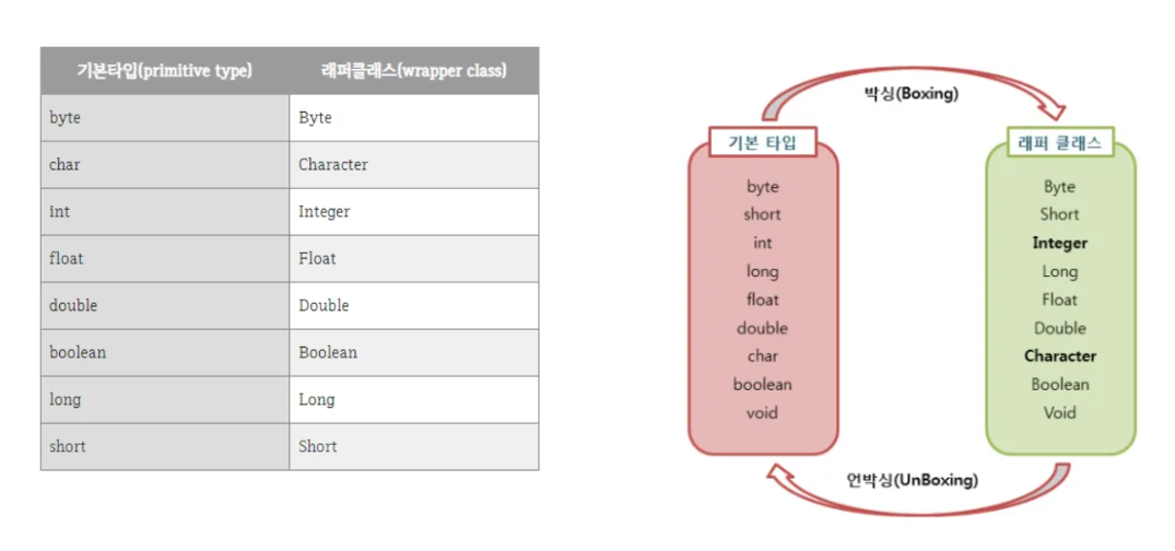 프로그래밍을 하다 보면 기본 타입의 데이터를 객체로 표현해야 하는 경우가 종종 있습니다. 이럴 때에 기본 자료타입(primitive type)을 객체로 다루기 위해서 사용하는 클래스들을 래퍼 클래스(wrapper class)라고 합니다.