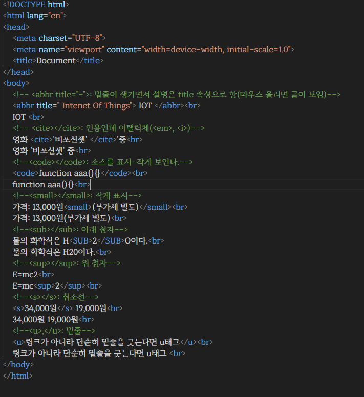 <sub> 요소 내부의 텍스트는 일반 텍스트 라인보다 아래쪽에 절반 크기의 작은 문자로 표현되며,