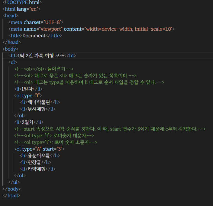 <ol> 태그 type을 이용하여 순서 타입을 정하거나 start 속성으로 시작 순서를 정할 수 있다.
