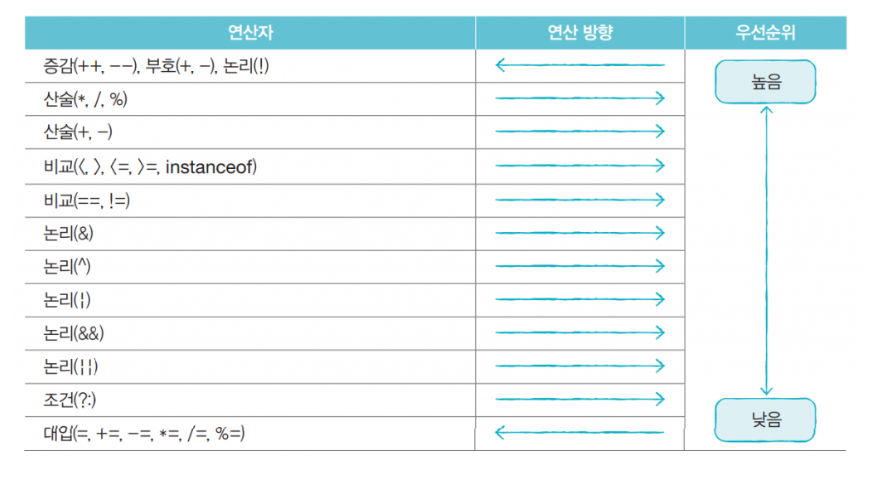 - 단항, 부호, 대입 연산자를 제외한 모든 연산의 방향은 왼쪽에서 오른쪽입니다.