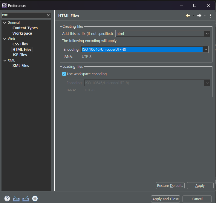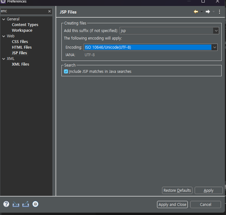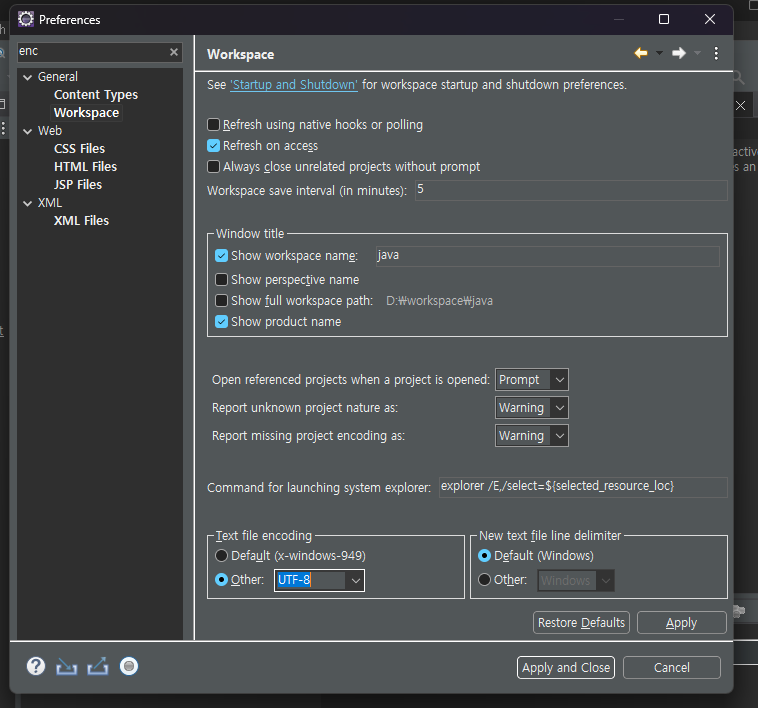 그 후 Preferences 속성창에서 검색창 enc 입력