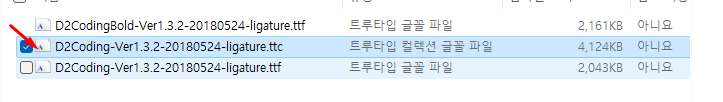 파일에 들어가면 D2Coding-Ver1.3.2-20180524-ligature.ttc 파일을 볼 수 있습니다