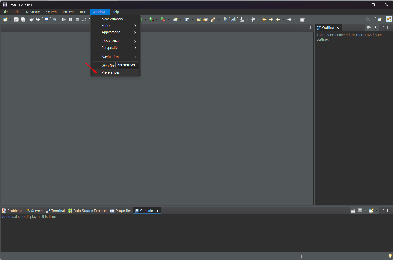 프로그램 실행 후 초기 화면에서 왼쪽 상단에 있는 window 클릭 후 preference 를 클릭합니다