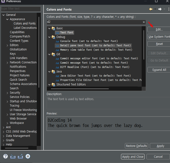 아래 창이 나타나면 아까 다운로드한 D2Coding을 설정하여 확인해줍니다.