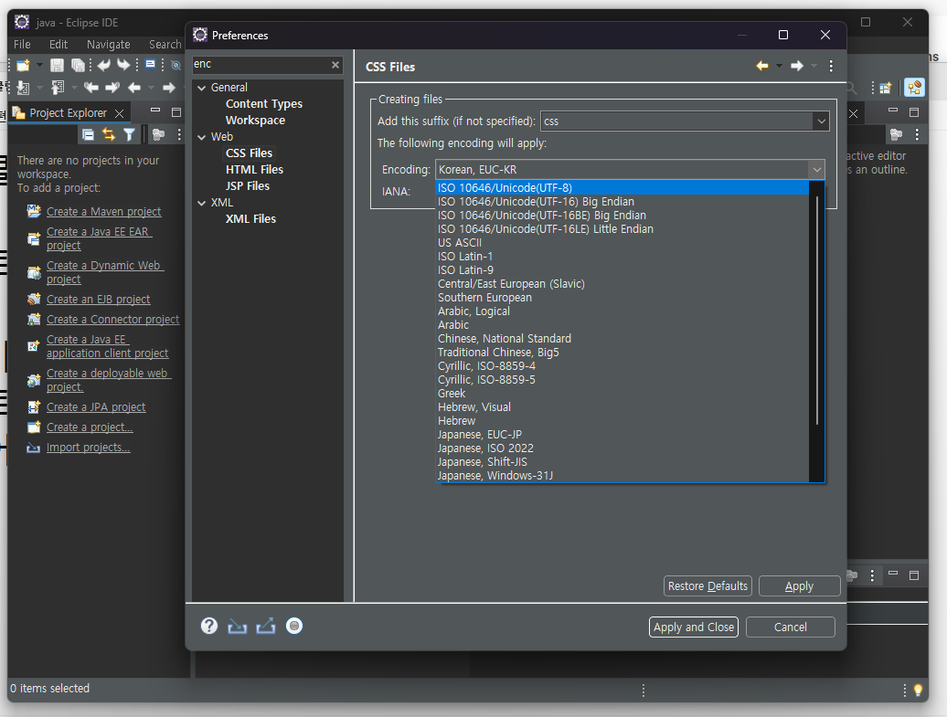 모두 Encoding 을 (UTF-8)로 변경 후 Apply