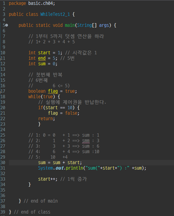1 부터 10까지 덧셈에 연산을 콘솔창에 출력 하시오 단, while 구문 작성