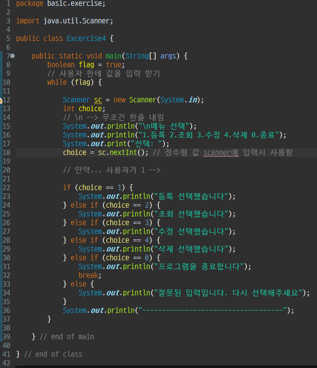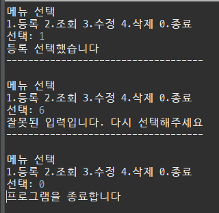 - “1.등록 2.조회 3.수정 4.삭제 0.종료”