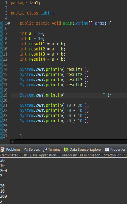 다음과 같이 피연산자 20과 10을 가지고 사칙 연산한 결과를 출력하는 자바 프로그램을 JDK와 이클립스를
