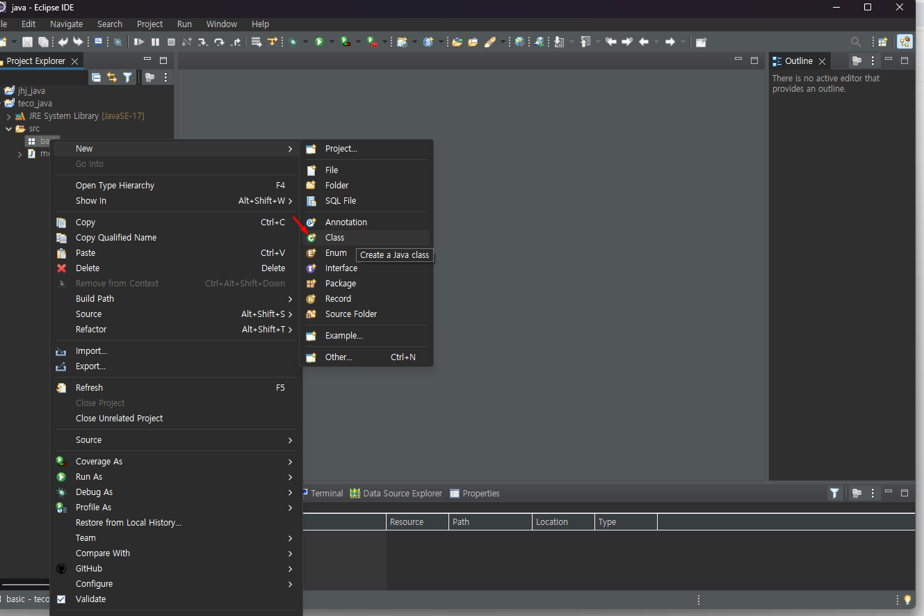 프로젝트 하위에 basic 이라는 package 생성
