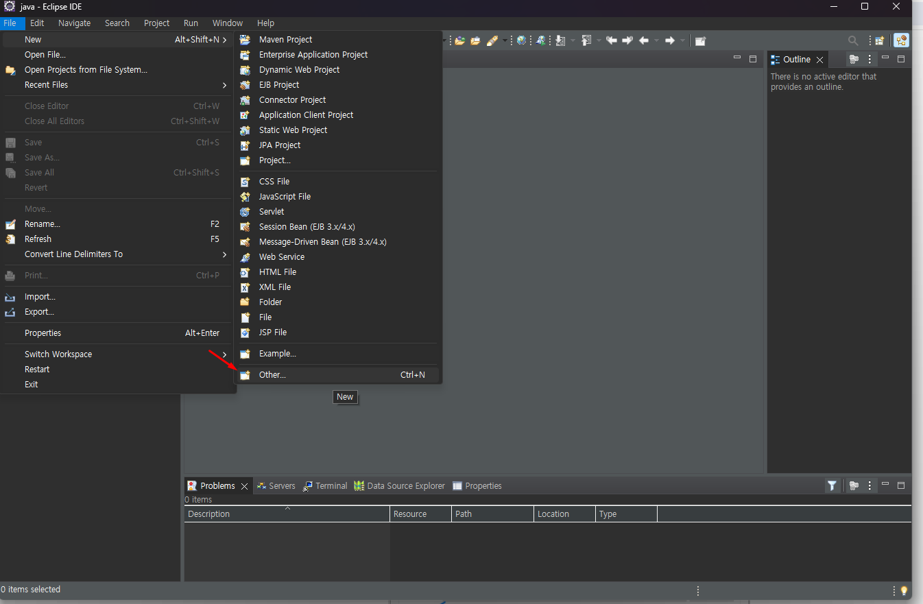File 에서 New 하위 Other 클릭하여
