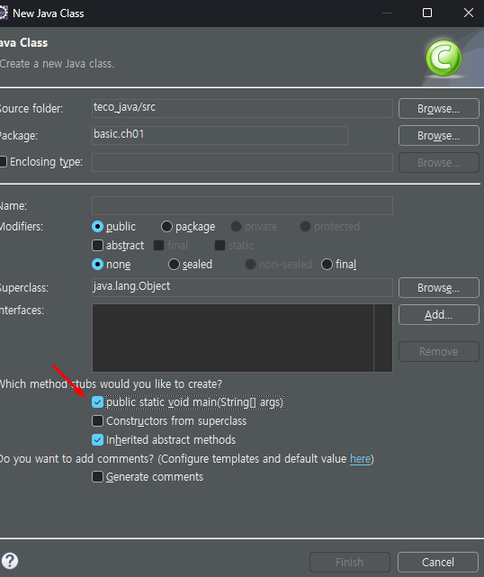 class 생성 시에 public static void main(String[] args) 체크 시