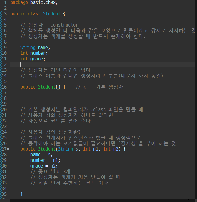 - 생성자의 이름은 클래스의 이름과 동일해야 합니다.