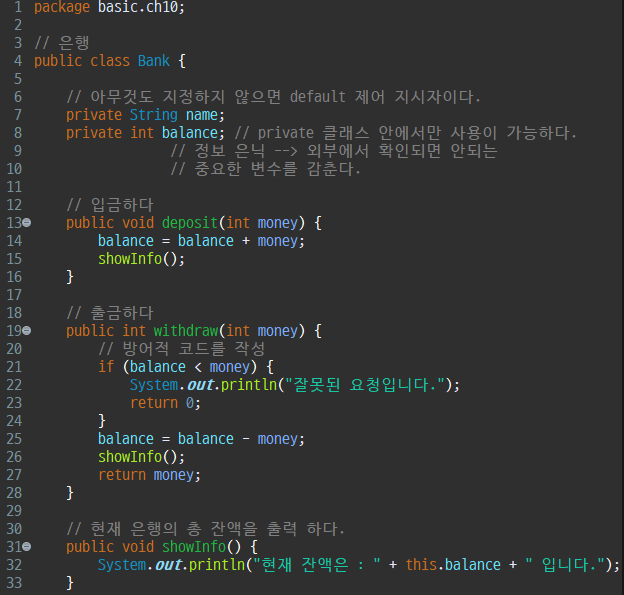변경하지 못하는게 하는것이다 따라서 클래스 안에 변수를 선언할 때는 private을 붙인다