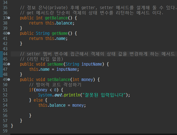 - 접근자에서 매개 변수를 통하여 잘못된 값이 넘어오는 경우, 이를 사전에 차단할 수 있다.
