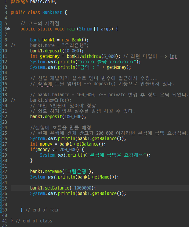 객체의 각각의 상태값은 직접 변수를 통해서 변경하는 것이 아닌 기능(행위, 메서드)을 통해서 변경하게 설계 해야 한다.