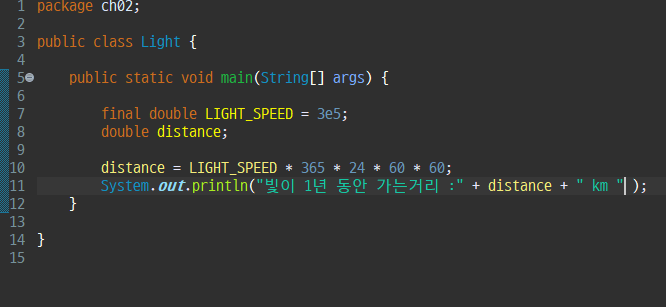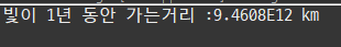 예제1) double형의 변수를 사용해서 빛이 1년 동안 진행하는 거리를 계산하여 보자.