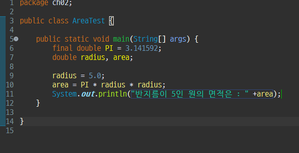 예제2) 반지름이 5.0인 원의 면적을 계산하는 프로그램을 작성해보자. 모든 변수를 실수형으로 정의하라. 파이는 상수