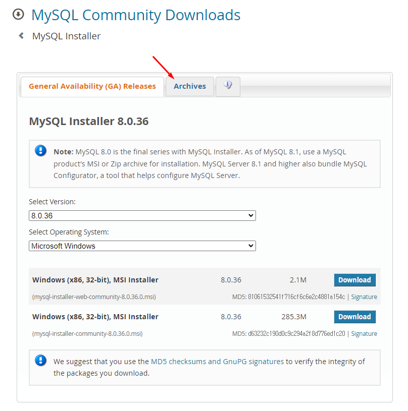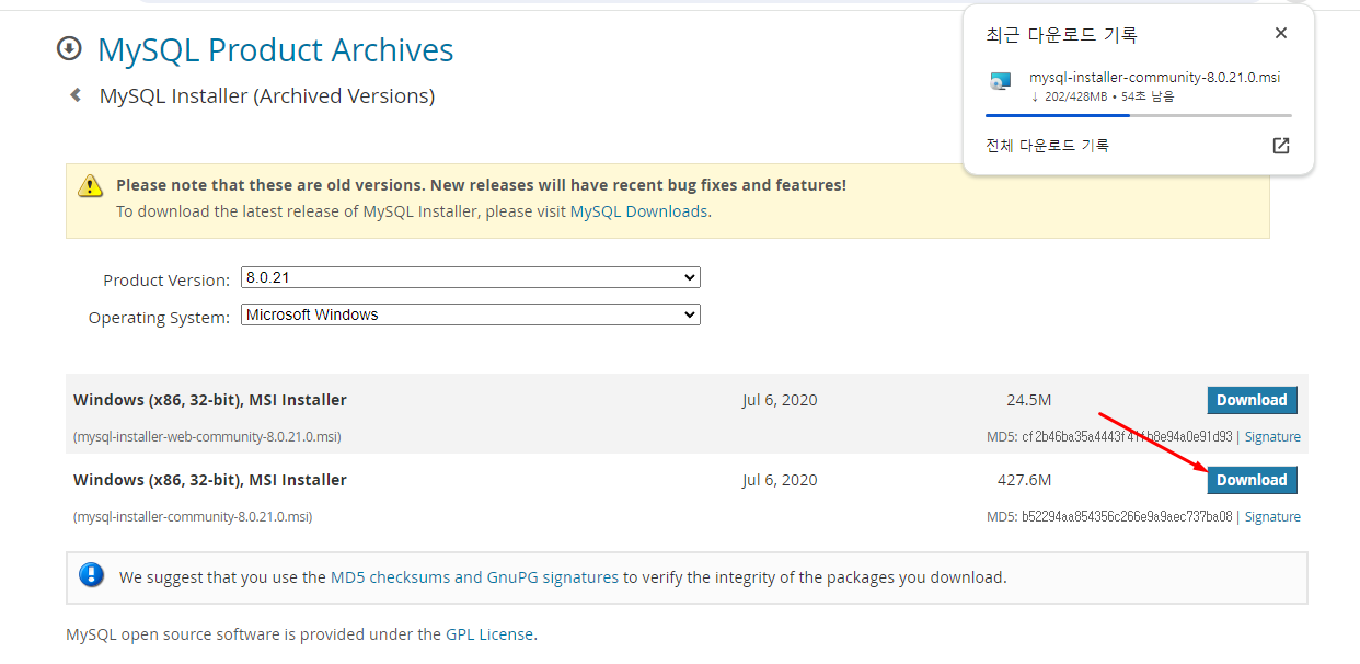최신버전이 아닌 안정화된 버전으로 다운받으려면 Archives 클릭