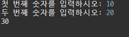 첫 번째 숫자를 입력하시오 : 10 두 번째 숫자를 입력하시오 : 20 30 |