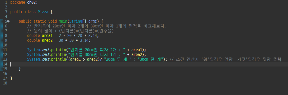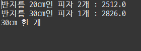 반지름이 20cm인 피자 2개와 30cm인 피자 1개의 면적을 비교해보자.