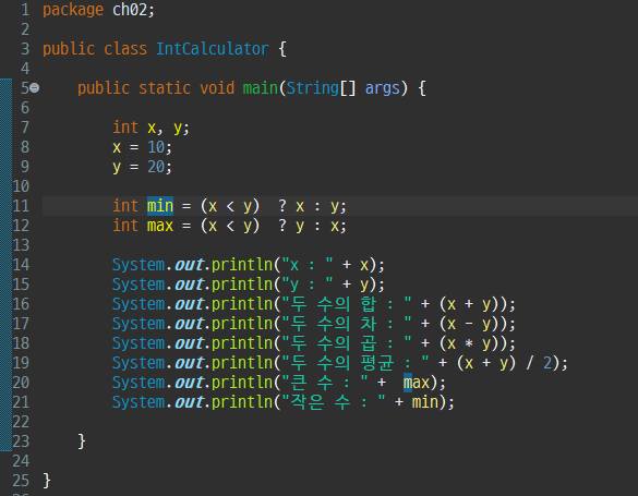 화면에 출력하는 프로그램을 작성하라. 큰 수와 작은 수를 구할 때는 조건연산자를 사용해보자.