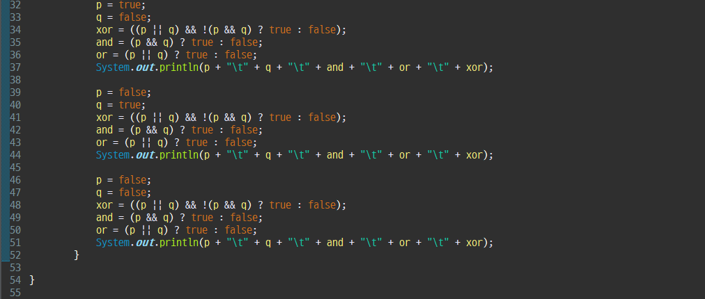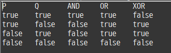 4. 자바의 기본 논리 연산에 대한 진리표를 다음과 같이 표시하는 프로그램을 작성해보자.