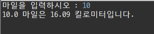 2. 마일을 킬로미터로 변환하는 프로그램을 작성하라. 1마일은 1.609킬로미터와 같다.