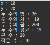 3. 사용자로부터 두 개의 정수를 받아서 정수의 합, 정수의 차, 정수의 곱, 정수의 평균, 큰 수,작은 수를 계산하여