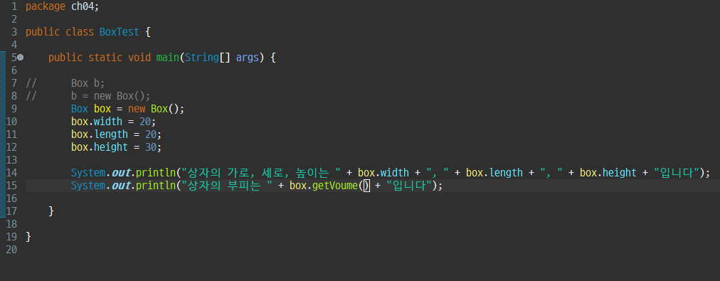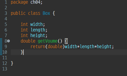 예제 4-2 ) Box 클래스를 정의 하고 Box 객체를 하나 생성한다. Box 가로,세로,높이 설정하여 부피를 출력해보자