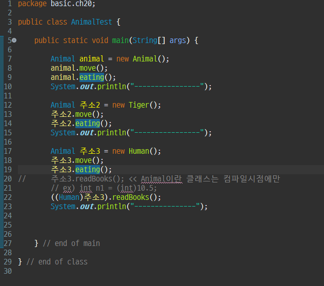 - 다운캐스팅은 명시적으로 형변환을 해야 합니다.