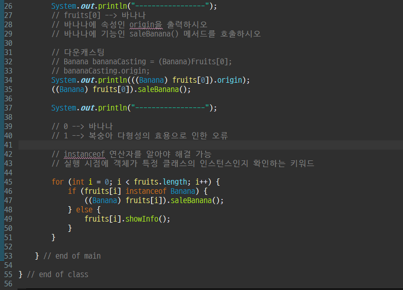 - 다운캐스팅은 업캐스팅된 객체가 실제로 자식 클래스의 객체일 때만 가능합니다. 그렇지 않으면 ClassCastException(예외) 이 발생할 수 있습니다.