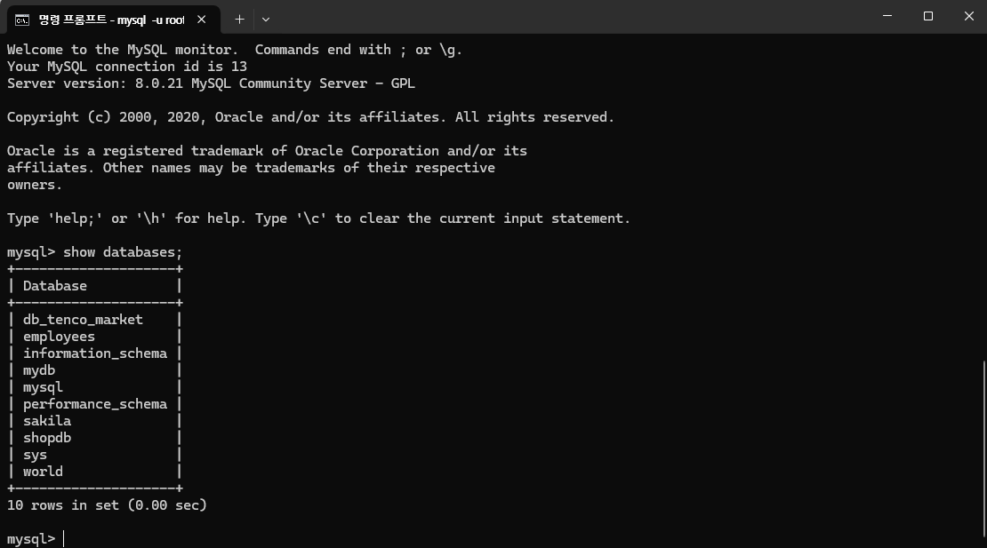 비밀번호 입력후 엔터 mysql 프로그램 안으로 들어오게 됩니다.