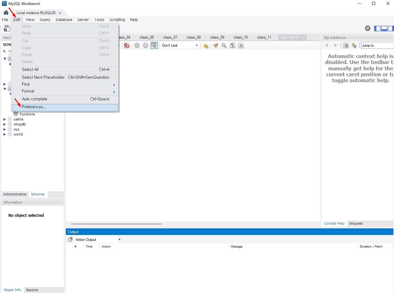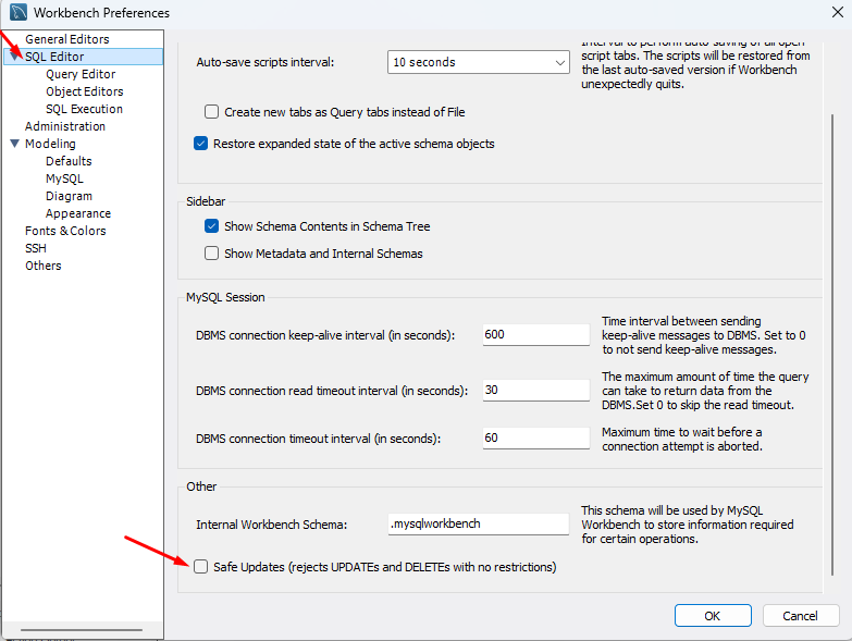 SQL Editor —> Safe Updates 에 체크를 해지 합니다.