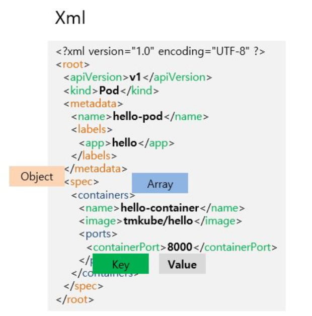 태그형식을 통해서 Key와 Value를 구분하고, 태그안에 태그를 넣어서 부모와 자식관계의 구조를 나타냅니다. 근데 위에 Object와 Array 부분은 표시를 해놨지만 Xml포맷상으로는 구분이 안되는 부분도 있습니다.