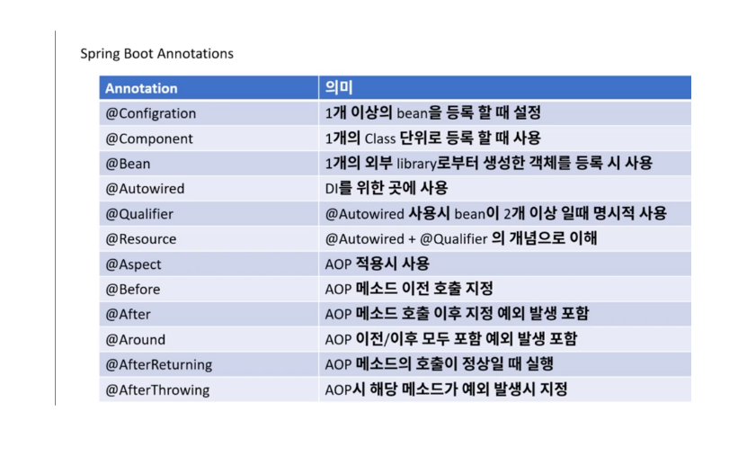- @Autowired: 의존성 주입(Dependency Injection)을 수행할 때 사용되며, 필드, 생성자, 메서드에 적용할 수 있습니다.