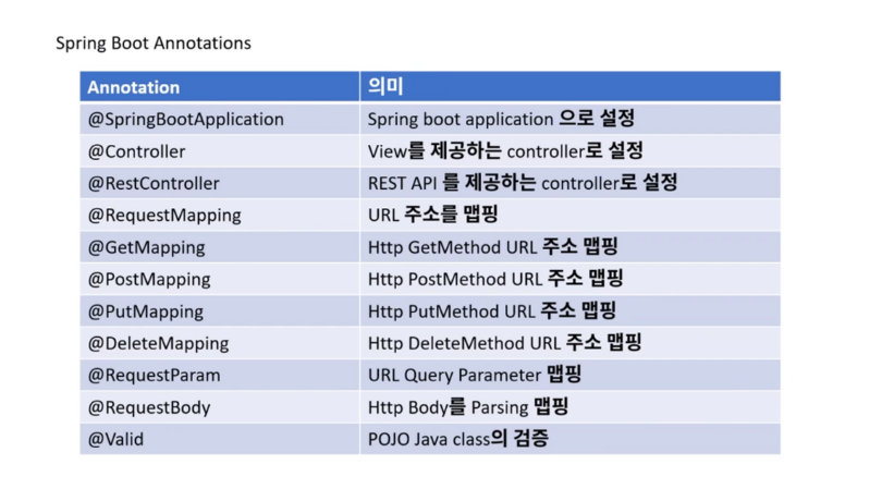 - @RestController: RESTful 웹 서비스의 컨트롤러 클래스를 표시합니다. **@Controller**와 **@ResponseBody**를 함께 사용하는 단축 형태입니다.