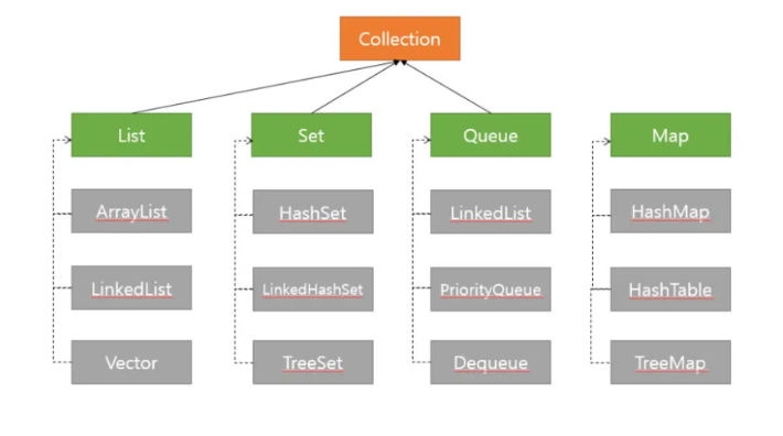 즉, 데이터를 저장하는 자료 구조와 데이터를 처리하는 알고리즘을 구조화하여 클래스로 구현해 놓은 것입니다. 이러한 컬렉션 프레임워크는 자바의 인터페이스(interface)를 사용하여 구현됩니다.