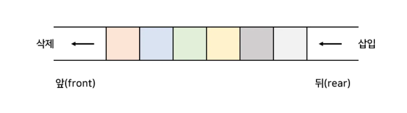 - 맨 앞(front) 에서 자료를 꺼내거나 삭제하고, 맨 뒤(rear)에서 자료를 추가 함