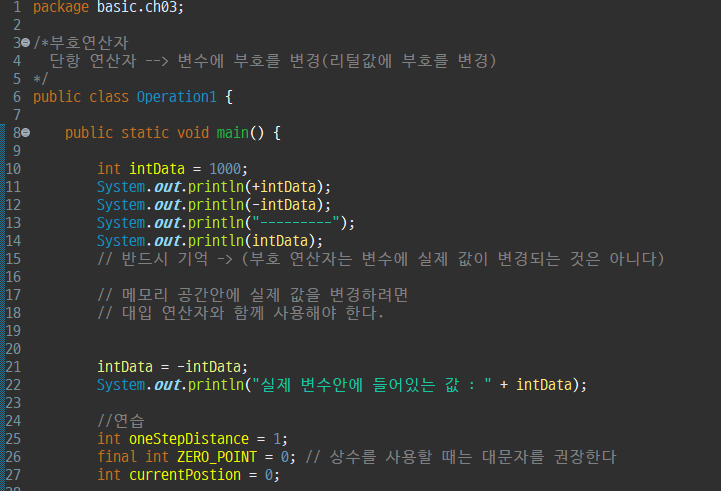- 연산자는 변수의 부호를 그대로 두고, - 연산자는 변수의 부호를 반전시킵니다. 변수의 실제 값을 변경하고자 할 때는 부호 연산자와 함께 대입 연산자를 사용해야 합니다.