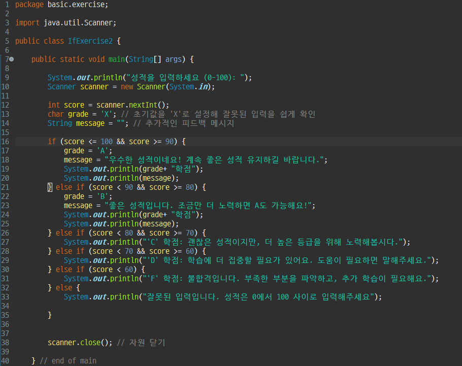 - 사용자로부터 성적을 입력받기 위해 Scanner 클래스를 사용하세요.