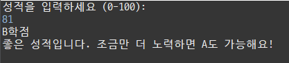 - 입력 받은 성적이 범위를 벗어날 경우, 적절한 안내 메시지를 출력하고 프로그램을 종료하세요.