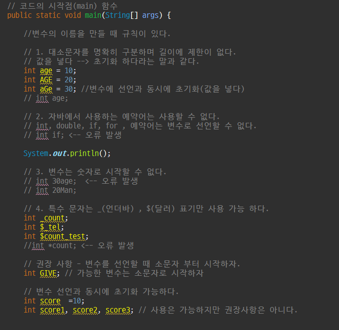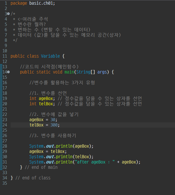 변수란 데이터를 담을 수 있는 메모리 공간이며 같은 종류에 데이터 타입의 값을 넣을 수 있다.